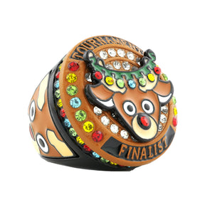 This vibrant ring features an adorable reindeer face decked out in colorful Christmas lights, surrounded by a dazzling array of multicolored stones in red, green, yellow, blue, and clear. The “TOURNAMENT FINALIST” banner proudly recognizes your team’s outstanding effort, while the detailed brown finish and antler side design bring the holiday theme to life.