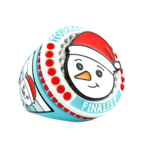 This charming ring features a smiling snowman in a Santa hat, surrounded by sparkling red and clear stones and framed by a crisp ice-blue “TOURNAMENT FINALIST” banner. The lighthearted winter design paired with championship-level detailing makes it a perfect keepsake for any holiday tournament or end-of-year event.