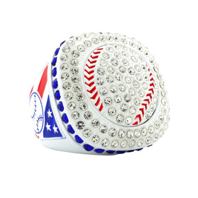 Featuring a dazzling white-tone softball/baseball design, accented with clear rhinestones and set on a white base, this ring delivers serious championship energy. With patriotic detailing and bold presence, it's the ultimate keepsake for players who left it all on the field.