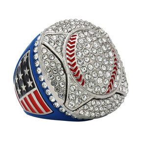 Featuring a dazzling silver-tone softball/baseball design, accented with clear rhinestones and set on a blue base, this ring delivers serious championship energy. With patriotic detailing and bold presence, it's the ultimate keepsake for players who left it all on the field.
