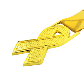 Crafted in a polished white finish with bold pink enamel, the medal features the iconic awareness ribbon shape, instantly recognizable and deeply meaningful. It’s paired with a full-length pink ribbon strap decorated with a subtle repeating awareness ribbon pattern, creating a unified and purposeful design.