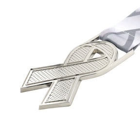 Crafted in a polished white finish with bold pink enamel, the medal features the iconic awareness ribbon shape, instantly recognizable and deeply meaningful. It’s paired with a full-length pink ribbon strap decorated with a subtle repeating awareness ribbon pattern, creating a unified and purposeful design.