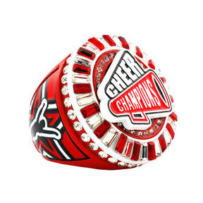 Built on a polished base, this ring shines with alternating rows of gemstones that create a striking, high-contrast look. The centerpiece features a raised megaphone design with the words “CHEER CHAMPION” in bold lettering instantly recognizable as a symbol of team spirit. Side panels continue the theme with cheer-inspired graphics, tying the design together with detail and flair.