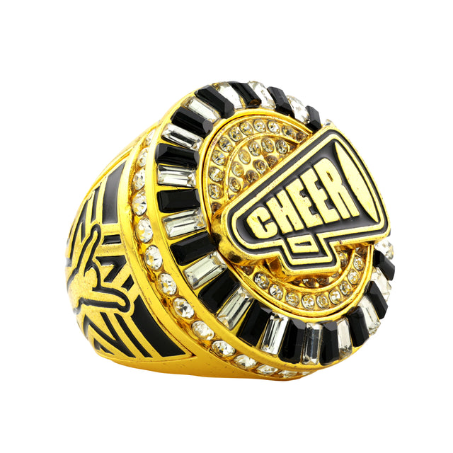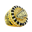 Built on a polished base, this ring shines with alternating rows of gemstones that create a striking, high-contrast look. The centerpiece features a raised megaphone design with the word “CHEER” in bold lettering, instantly recognizable as a symbol of team spirit. Side panels continue the theme with cheer-inspired graphics, tying the design together with detail and flair.