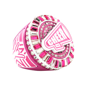 Built on a polished base, this ring shines with alternating rows of gemstones that create a striking, high-contrast look. The centerpiece features a raised megaphone design with the word “CHEER” in bold lettering, instantly recognizable as a symbol of team spirit. Side panels continue the theme with cheer-inspired graphics, tying the design together with detail and flair.