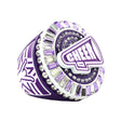 Built on a polished base, this ring shines with alternating rows of gemstones that create a striking, high-contrast look. The centerpiece features a raised megaphone design with the word “CHEER” in bold lettering, instantly recognizable as a symbol of team spirit. Side panels continue the theme with cheer-inspired graphics, tying the design together with detail and flair.