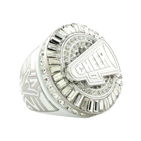 Built on a polished base, this ring shines with alternating rows of gemstones that create a striking, high-contrast look. The centerpiece features a raised megaphone design with the word “CHEER” in bold lettering, instantly recognizable as a symbol of team spirit. Side panels continue the theme with cheer-inspired graphics, tying the design together with detail and flair.