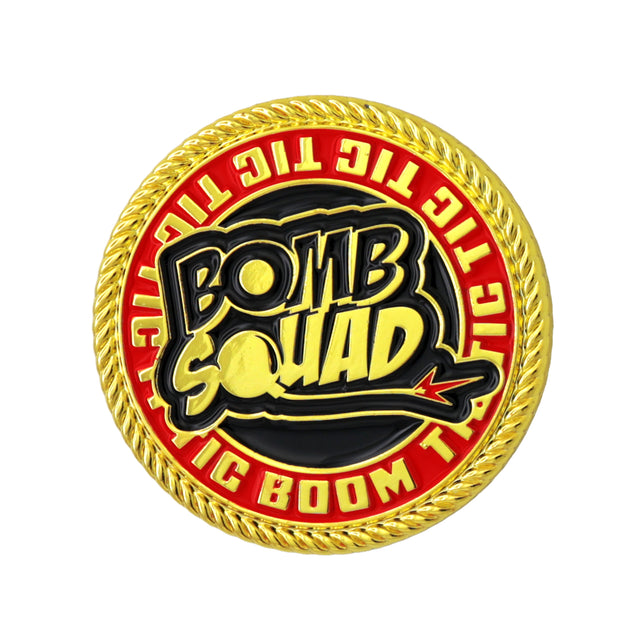 Ignite the excitement with our Bomb Squad Coin Gold — an explosive tribute to power hitting and big plays! This brilliant coin boasts a vibrant red-and-black enamel design, framed by a bold gold rope border that radiates prestige.