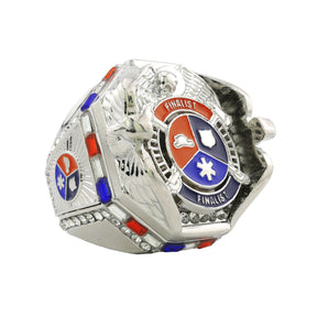 Crafted with a silver-tone finish, the ring features a bold shield-style centerpiece framed by a soaring eagle. The face is detailed with red, blue, and white enamel sections, each representing first responder roles—fire, EMS, and law enforcement. Clear gemstones border the design for a championship-level shine, while side panels highlight matching service emblems and patriotic details.