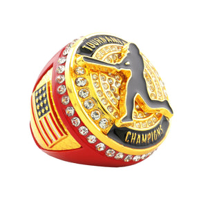 Featuring a dazzling gold-tone softball/baseball design, accented with clear rhinestones and set on a red base, this ring delivers serious championship energy. With patriotic detailing and bold presence, it's the ultimate keepsake for players who left it all on the field.