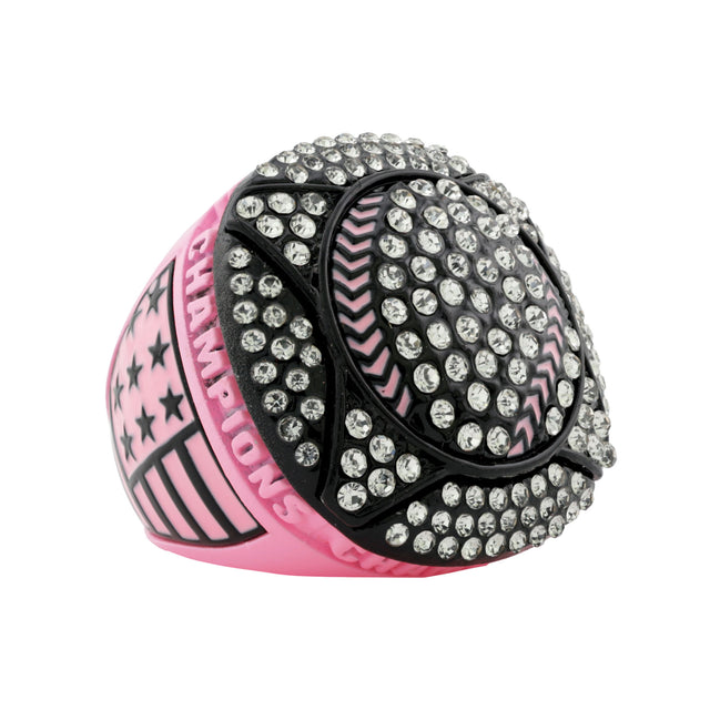 Featuring a dazzling black-tone softball/baseball design, accented with clear rhinestones and set on a pink base, this ring delivers serious championship energy. With patriotic detailing and bold presence, it's the ultimate keepsake for players who left it all on the field.