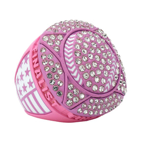 Featuring a dazzling softball/baseball design, accented with clear rhinestones and set on a pink base, this ring delivers serious championship energy. With patriotic detailing and bold presence, it's the ultimate keepsake for players who left it all on the field.