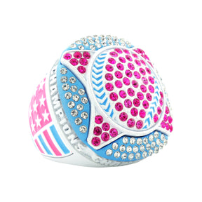 Featuring a dazzling pink-tone softball/baseball design, accented with clear rhinestones and set on a white base, this ring delivers serious championship energy. With patriotic detailing and bold presence, it's the ultimate keepsake for players who left it all on the field.