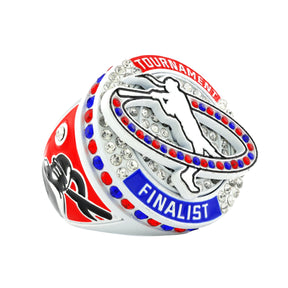 This eye-catching ring showcases a bold swinging batter silhouette, framed by a halo of brilliant stones that sparkle with every reflection of the field lights. The “TOURNAMENT FINALIST” banner crowns the centerpiece, symbolizing excellence and achievement at the highest level.