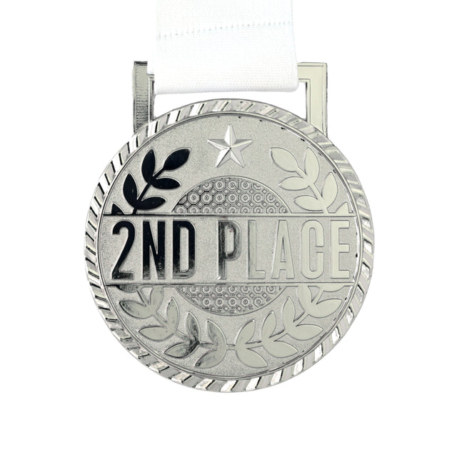 Featuring a polished silver medal face embossed with “2nd PLACE” and a classic laurel wreath design, this piece radiates prestige. The black ribbon adorned with crisp white stars adds a bold, professional touch that makes it stand out on the podium.