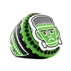 Featuring a sleek black base with vibrant green accents, the ring is fully lined with black and green gemstones for maximum impact. At the center, the stylized Frankenstein face brings a fierce, instantly recognizable look, outlined for sharp contrast. Matching side panel graphics carry the theme all the way around, making this design pop from every angle.
