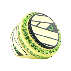 Built on a light beige base, the ring features striking green gemstones encircling the face for maximum impact. The centerpiece showcases a bold mummy wrap design with a piercing green eye peeking through, giving it a sharp, unforgettable character. Matching side panels continue the wrapped bandage theme, making the design cohesive from every angle.