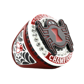 Set on a deep red base, this ring features bright white and black detailing accented with clear gemstones for a sharp, polished look. The centerpiece showcases a stylized spider emblem with an hourglass design, framed by Tournament and Champions engravings for an official, trophy-worthy finish. Side panels carry the theme with a clean web pattern and red hourglass accent, adding detail from every angle.