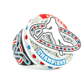 Featuring a striking hockey player silhouette at the center, framed by radiant ovals of shimmering stones, this ring perfectly captures the speed, precision, and power of championship hockey. The “CHAMPIONS” banner wraps proudly along the base, while the detailed crossed-stick engravings on the sides bring the sport’s spirit to life.