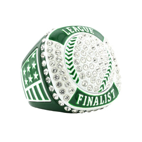 Featuring a dazzling white-tone softball/baseball design, accented with clear rhinestones and set on a green base, this ring delivers serious finalist energy. With patriotic detailing and bold presence, it's the ultimate keepsake for players who left it all on the field.
