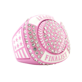 Featuring a dazzling pink-tone softball/baseball design, accented with clear rhinestones and set on a pink base, this ring delivers serious finalist energy. With patriotic detailing and bold presence, it's the ultimate keepsake for players who left it all on the field.