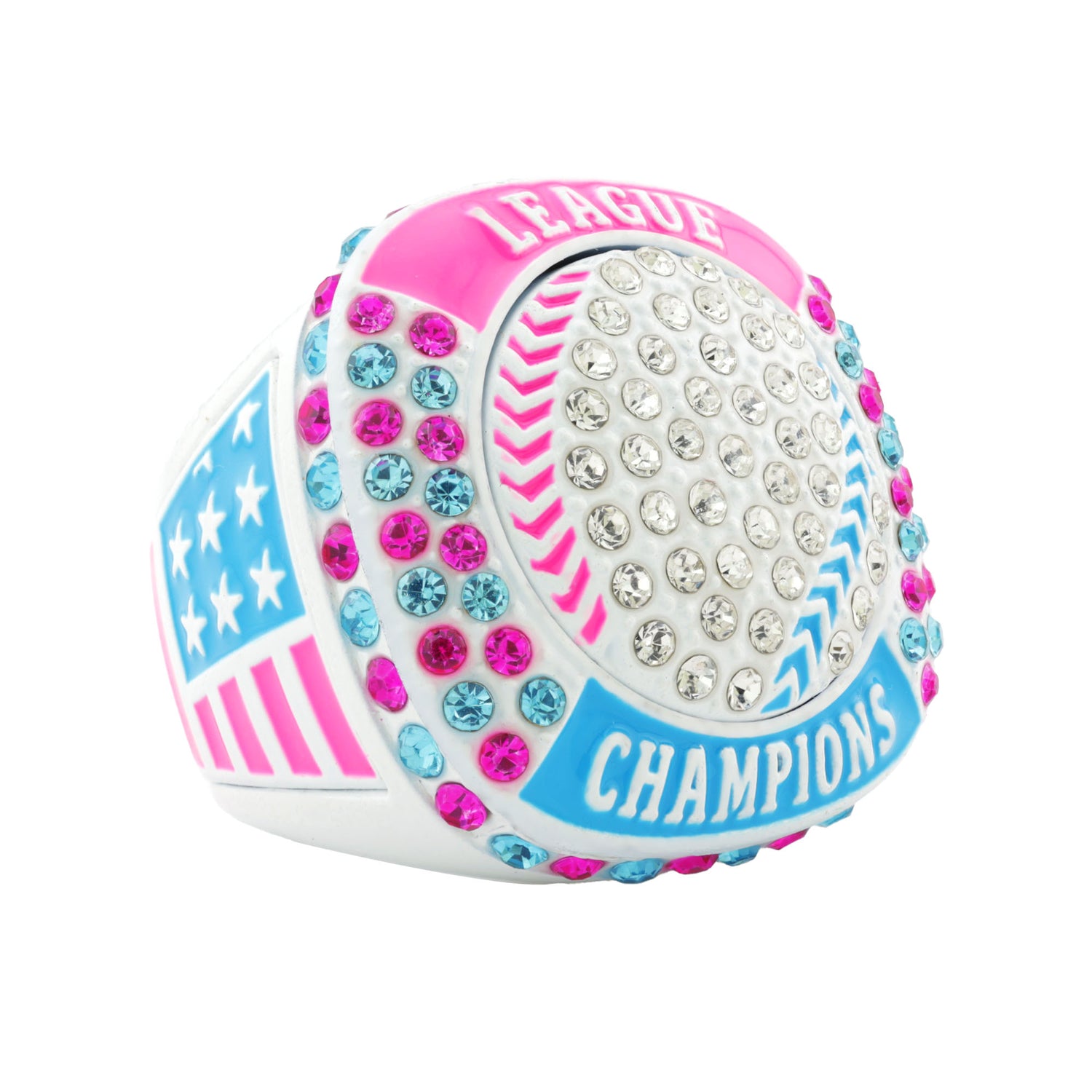 Featuring a dazzling white-tone softball/baseball design, accented with clear rhinestones and set on a white base, this ring delivers serious championship energy. With patriotic detailing and bold presence, it's the ultimate keepsake for players who left it all on the field.