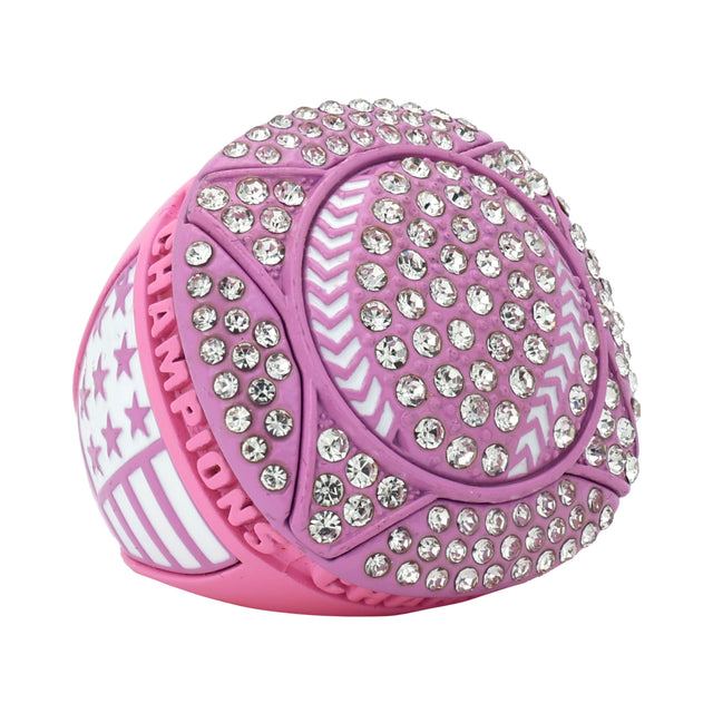 Featuring a dazzling softball/baseball design, accented with clear rhinestones and set on a pink base, this ring delivers serious championship energy. With patriotic detailing and bold presence, it's the ultimate keepsake for players who left it all on the field.