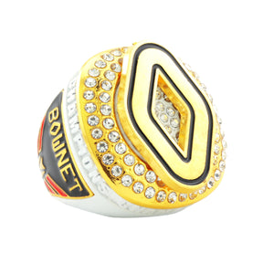 Celebrate victory with the Bownet Champions Ring — a symbol of elite performance and triumph. Crafted with a bold gold and white design, this ring features a striking geometric centerpiece surrounded by sparkling clear stones. The iconic "Bownet" name and championship text are etched on the sides, showcasing the pinnacle of success.