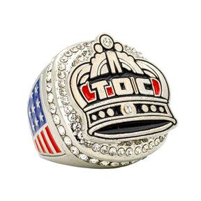 Celebrate victory in style with the GEN25 Tournament of Champions Finalist Ring. This bold, Silver ring features a stunning crown emblem surrounded by sparkling stones, symbolizing the ultimate achievement. The ring's sides showcase patriotic details with the American flag, adding a proud touch of national pride. Whether you’re a player or a fan, this ring is the perfect tribute to hard-earned triumph.