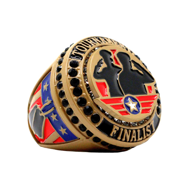 Stand tall and proud as you commemorate triumph and honor with our exclusive Military Tournament Finalist Ring. Crafted in a commanding camo tan, this ring embodies the spirit of courage and excellence, making it the perfect symbol for those who have displayed unwavering dedication in the face of challenges. Made out of high quality zinc alloy material with a weight of 68g. Every ring comes individually packaged in a velvet bag.