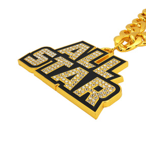 Featuring a polished finish, the pendant displays “ALL STAR” in bold, uppercase letters filled with sparkling clear stone accents for a dynamic, eye-catching look. The clean lines and vibrant color contrast make it pop, while the heavyweight silver chain adds durability and presence.