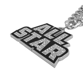 Featuring a polished finish, the pendant displays “ALL STAR” in bold, uppercase letters filled with sparkling clear stone accents for a dynamic, eye-catching look. The clean lines and vibrant color contrast make it pop, while the heavyweight silver chain adds durability and presence.