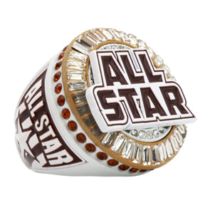 Shine like a true MVP with our All Star Ring! This striking piece features a bold "ALL STAR" emblem surrounded by dazzling stones, symbolizing excellence and achievement. The star and crescent accents, adds a powerful touch of flair. Crafted for durability and style, this ring is the ultimate accessory for all-star players and fans who take pride in their game.