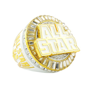 Shine like a true MVP with our All Star Ring! This striking piece features a bold "ALL STAR" emblem surrounded by dazzling stones, symbolizing excellence and achievement. The star and crescent accents, adds a powerful touch of flair. Crafted for durability and style, this ring is the ultimate accessory for all-star players and fans who take pride in their game.